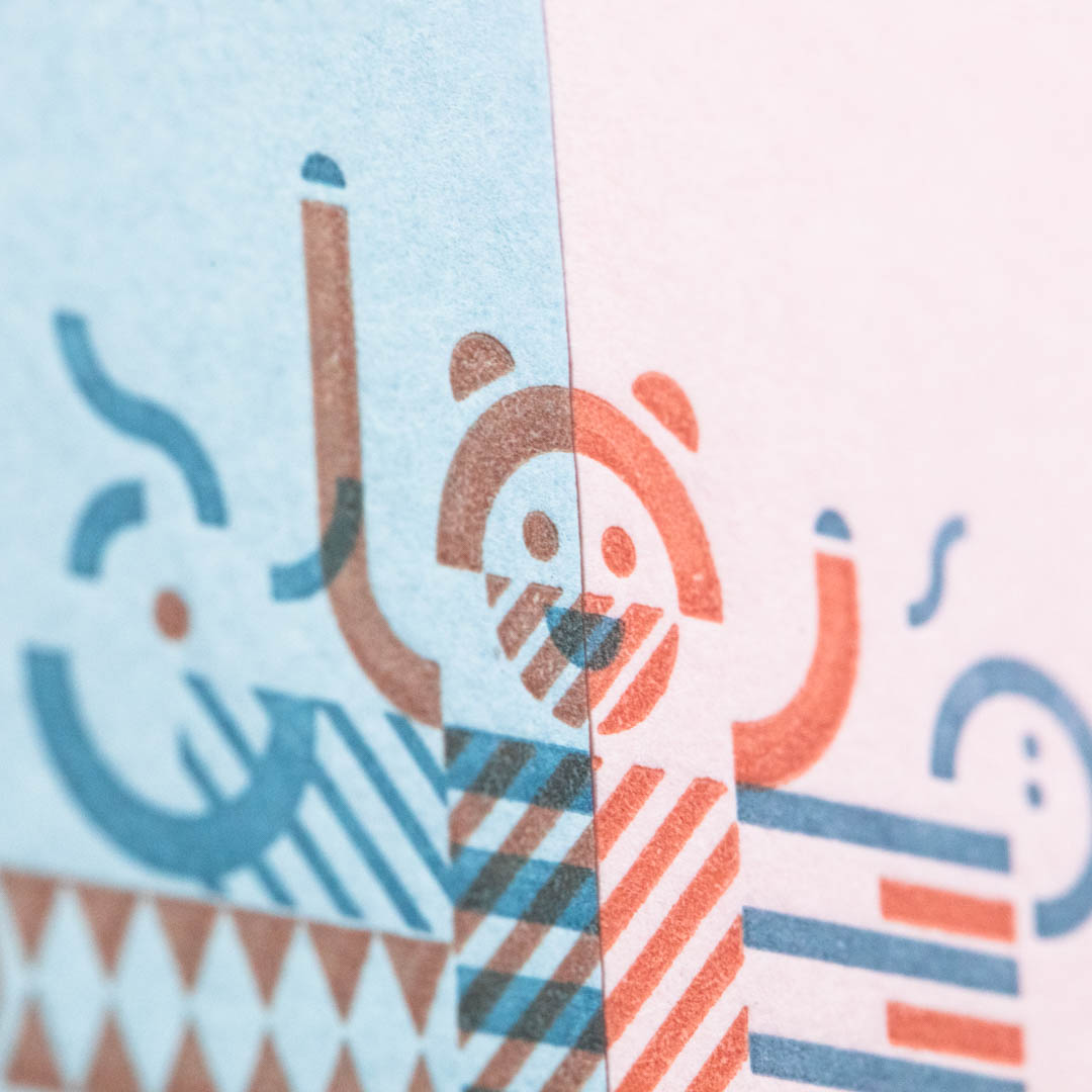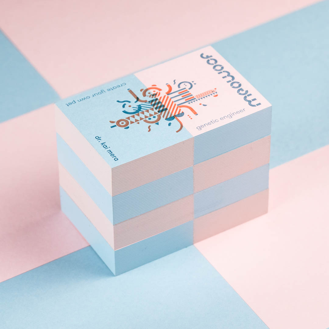 Klonen und Genetik werden ein Teil unseres Alltagsleben. Wer sich nicht zwischen einer Katze und einem Hund als Haustier entscheiden kann, lässt sich eine Chimäre anfertigen – die Frage ist, ob die Schöpfung „miau“ oder „wuff“ sagen wird. In Anlehnung an kinderfreundliches Design entstehen durch die Überlagerung von Grundformen verschiedenste Tiere. Die Karte selbst ist aus drei verschiedenen Papieren mit kontrastierendem Farbschnitt geformt.